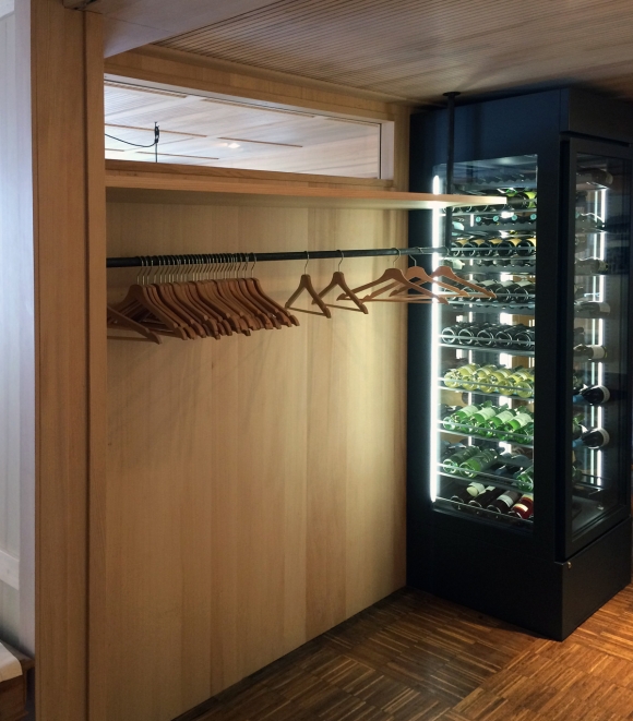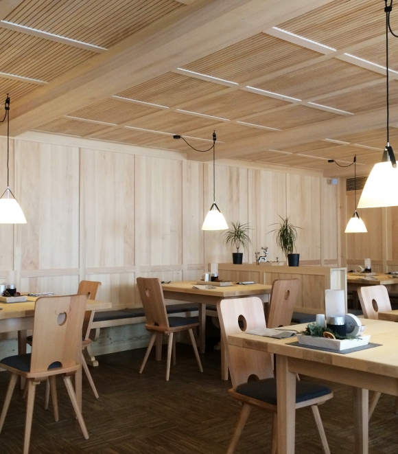 Hierfür wurde die Faltwand entfernt, welche bislang zwei Räume abgetrennt hatte. Neue Sitzbänke, Wand- und Deckenverkleidung wurde in Weißtanne verkleidet. Die Decke mit 4mm Spalt für die Akustik wurde auch für die flexible Deckenbeleuchtung verwendet. Hier wurde durch ein eigens hierfür hergestelltes Aufhängesystem gewährleistet, dass die Leuchten immer über den Tischen hängen, welche jetzt flexibel verschoben werden können. Der abgetrennte Raumteil wurde für kleine Veranstaltungen ebenfalls ansprechend hergerichtet mit einer indirekten Beleuchtung.